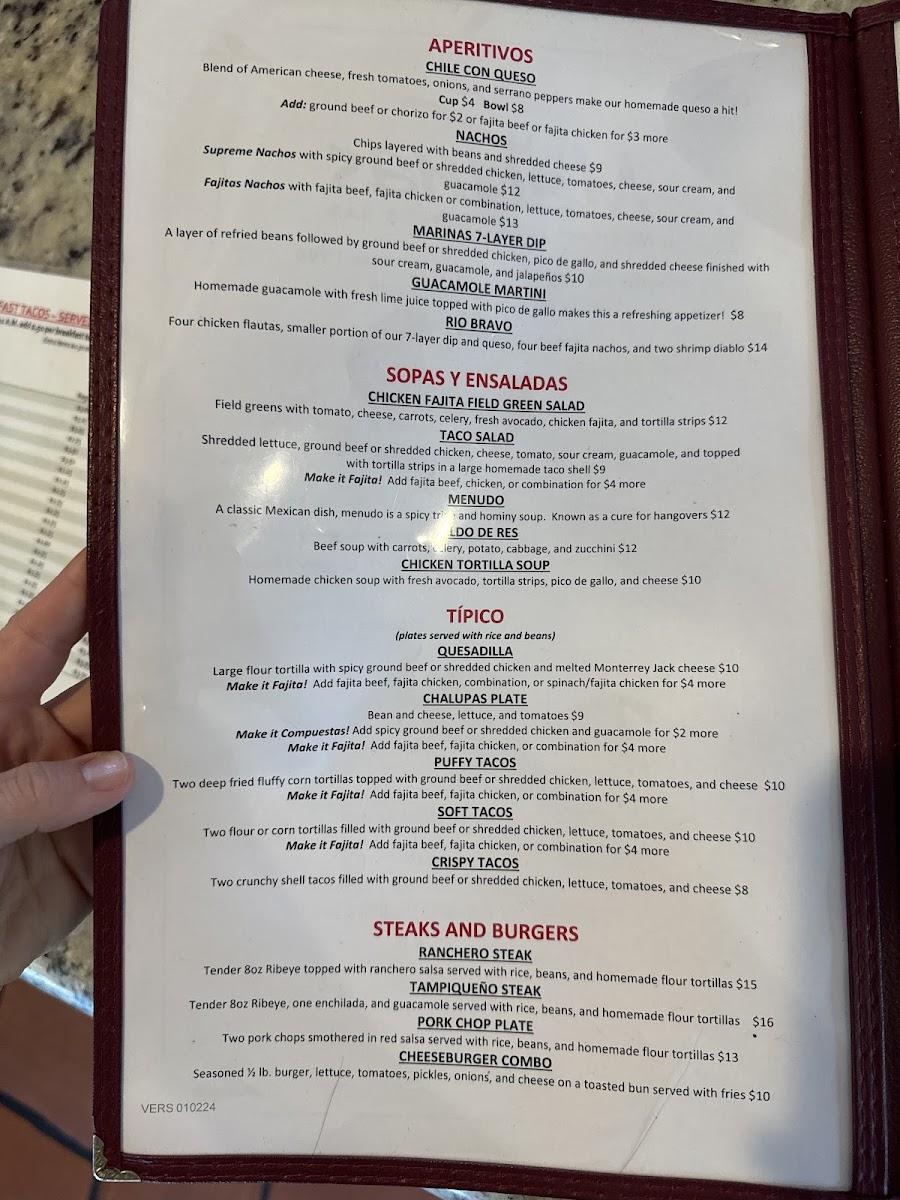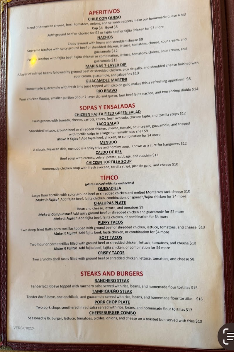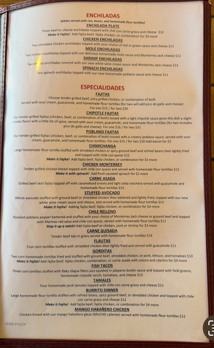 Roasted poblano pepper battered and stuffed with your choice of Monterrey Jack cheese or ground beef and topped with Marinas red salsa and chile con queso, served with homemade flour tortillas